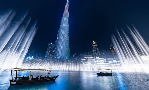 • پایه برج خلیفه و نمایش فوارهها: دیدن بلندترین ساختمان جهان از نزدیک و تماشای نمایش فوارههای دبی که هر ۳۰ دقیقه از عصر به بعد اجرا میشود یکی از مشهورترین تجربههای رایگان شهر است و شبها به اوج جذابیت میرسد.